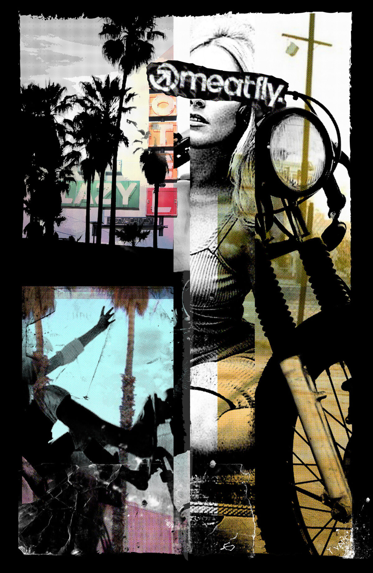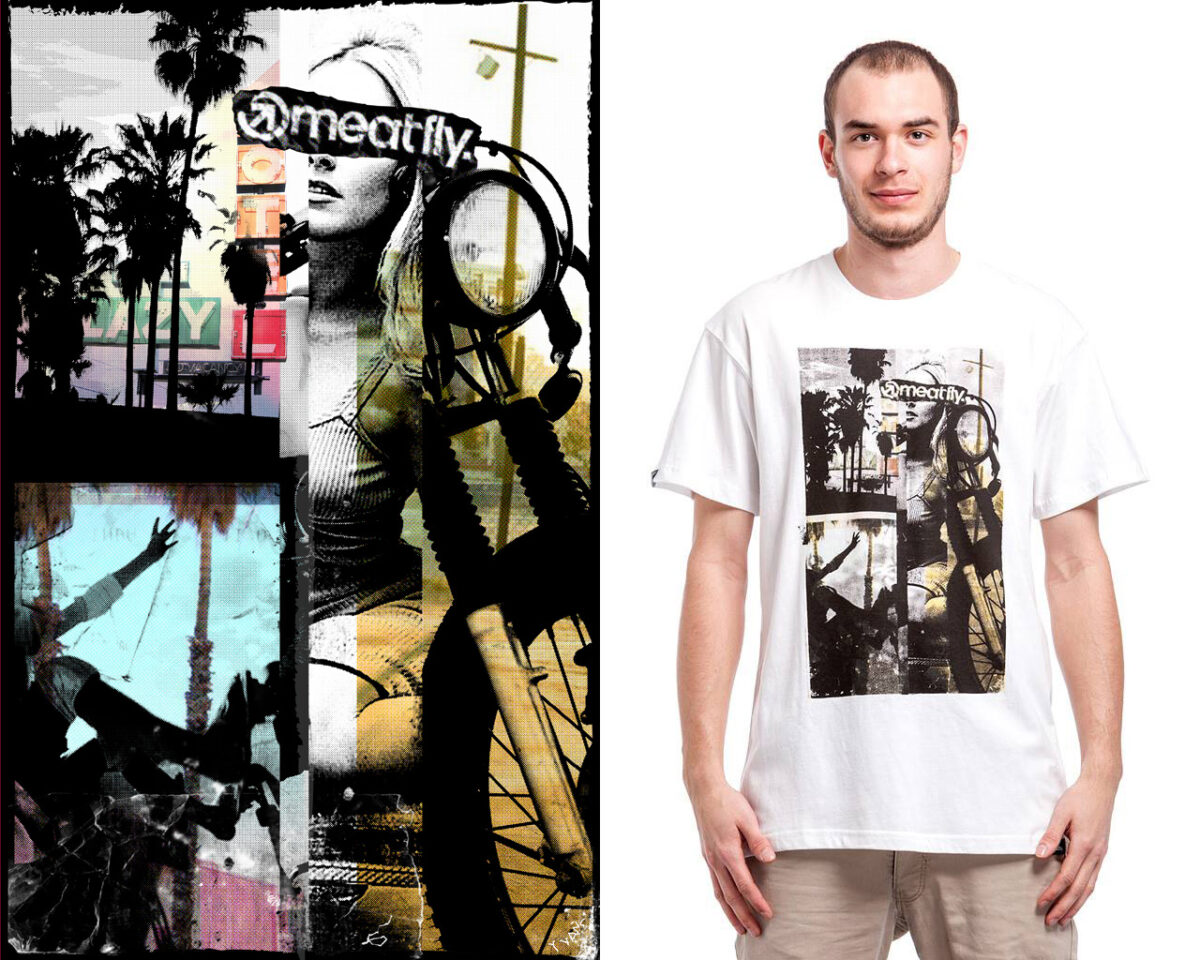 Toto už bylo trochu „goodbye“ tee. Jeden z motivů, který zůstaly viset někde uprostřed schvalovacího procesu, když jsem odcházel a až po letech jsem viděl, že se triko realizovalo. Mám to kolážový zpracování motivů na trika rád i když je to samozřejmě trochu míň pohodlný na nošení. Na jiný než Roberry si nedokážu vzpomenout, že bych pro meatfly takto udělal. V době vniku tohoto příspěvku jsem ale jedno další přidal a to pro Mighty Sounds 2026.